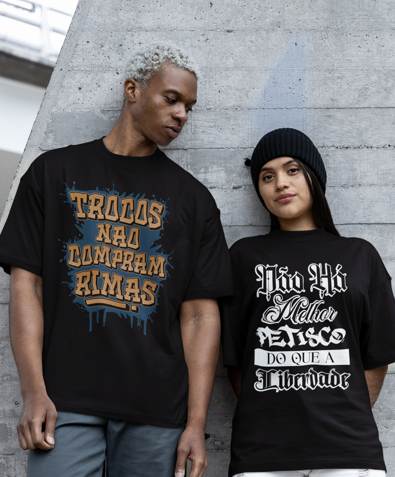 Trabalhamos com peças oversized, cortes conscientes e estampas que dizem o que muita gente tem medo de ouvir.